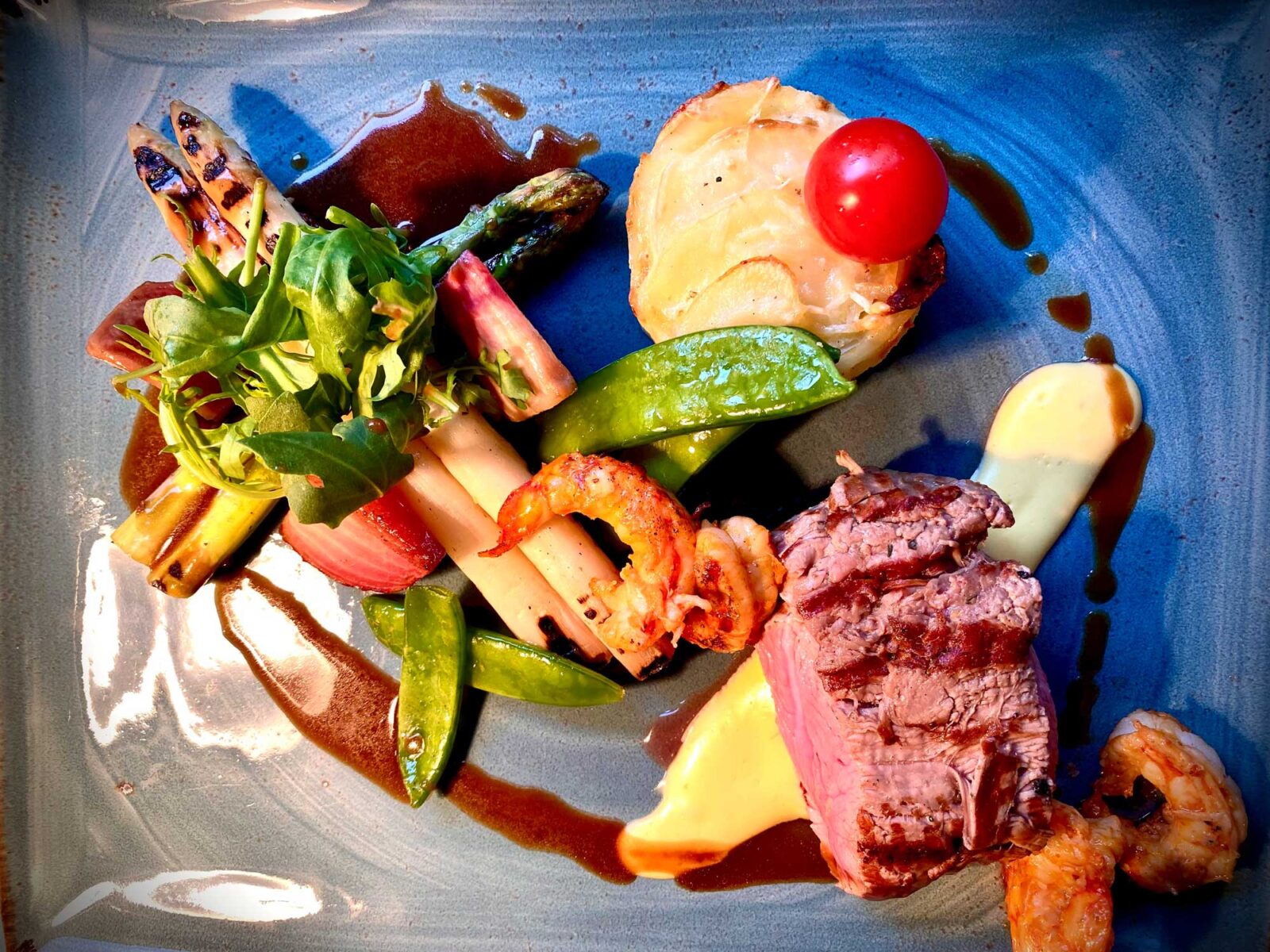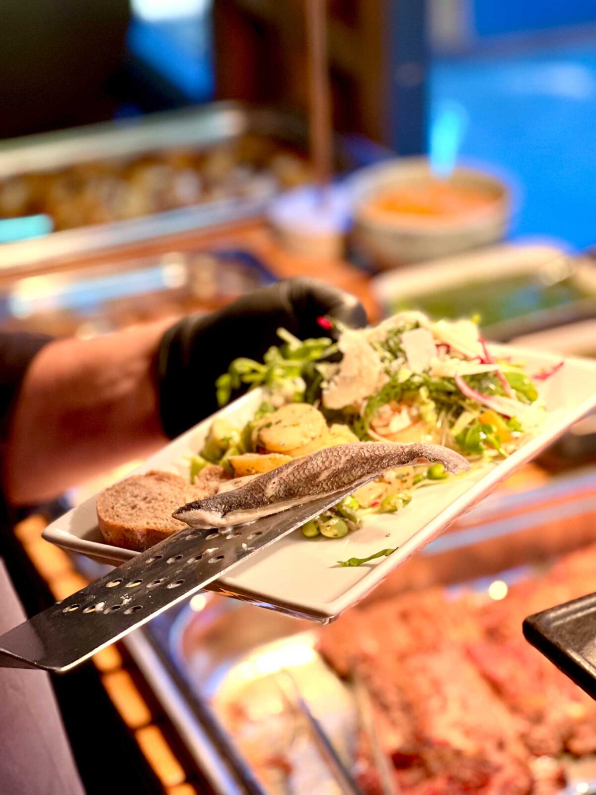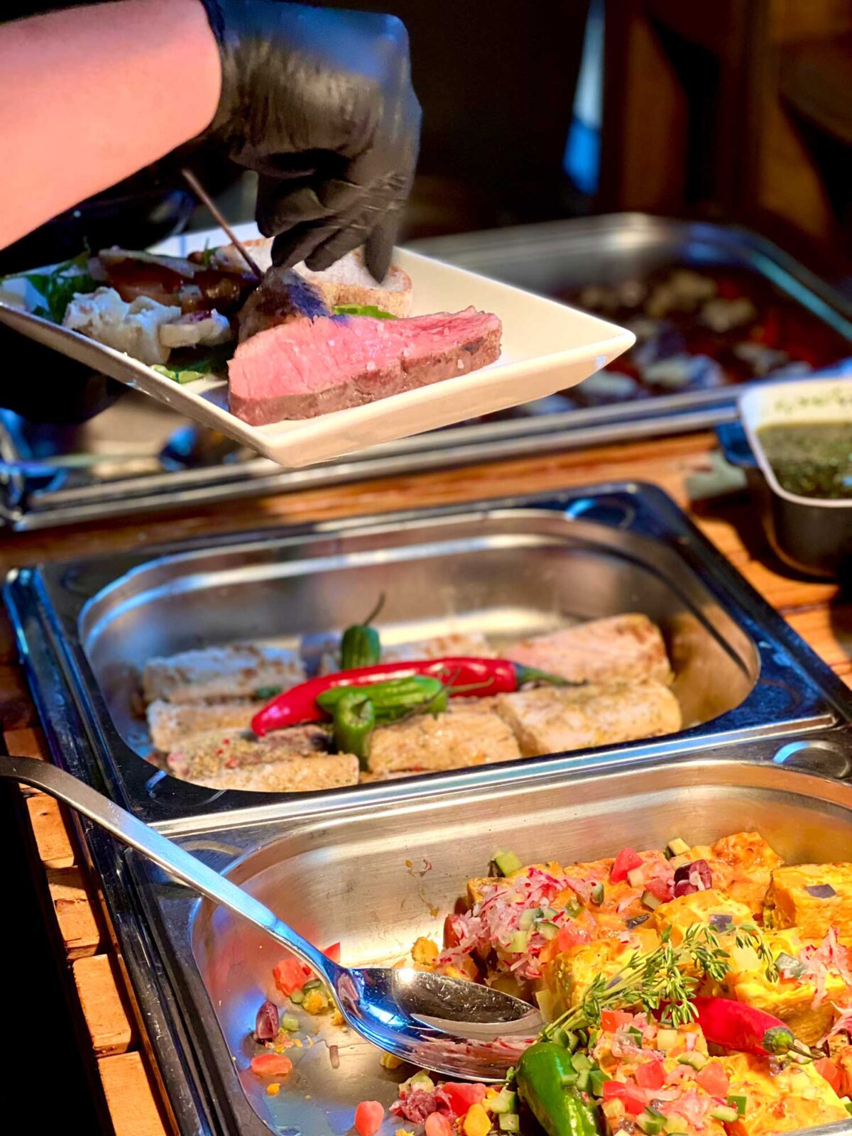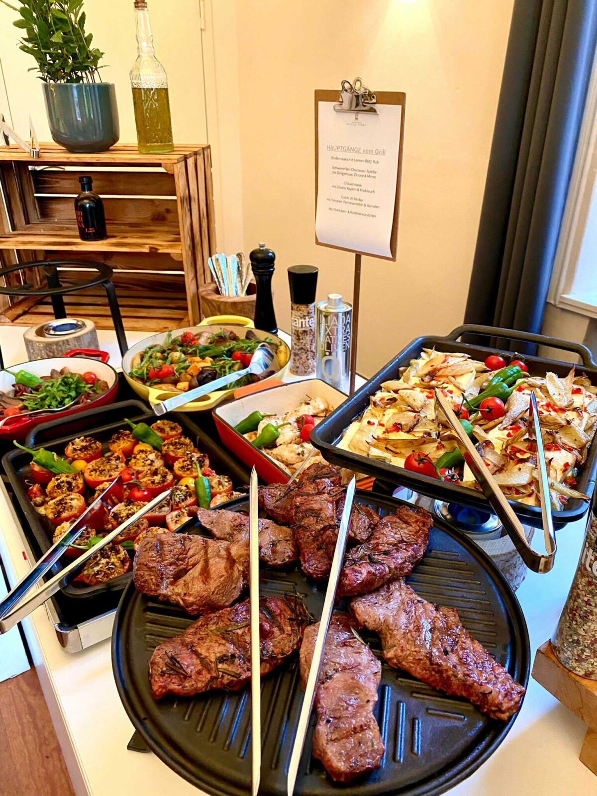 Das Hauptmenü auf der Grundlage von drei Fleisch-/Fischsorten, die Beilagen aus verschiedenen Salaten und Soßen und – last not least – zwei Sorten Nachtisch ein perfekter Genuss.